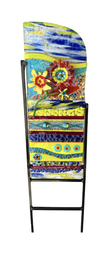 A vibrant 8″ x 21″ fused glass garden stake featuring playful, dimensional flowers rising through bands of color and light. Set in a sleek metal stand, it catches the sun and brings a joyful pop of color to any outdoor space.