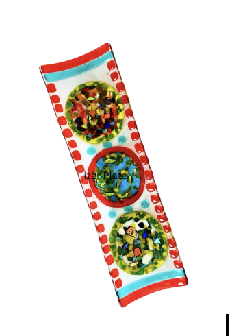 Three vibrant circular compositions line up in a playful rhythm, each one a burst of color and texture. Framed with bold red and aqua accents, this piece feels energetic and celebratory—like three moments of sunshine captured in glass.